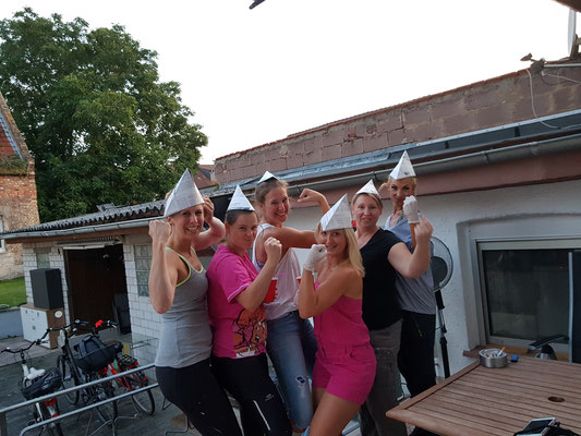 Die Aufgaben waren klar verteilt. Eine zum Abkleben, eine zum Rand pinseln, eine zum Vorstreichen u.s.w. Ach ja und eine zum Getränke nachfüllen :)