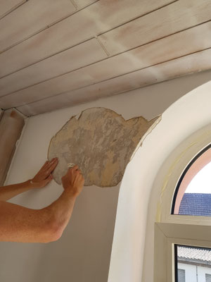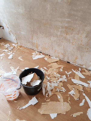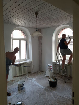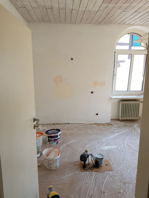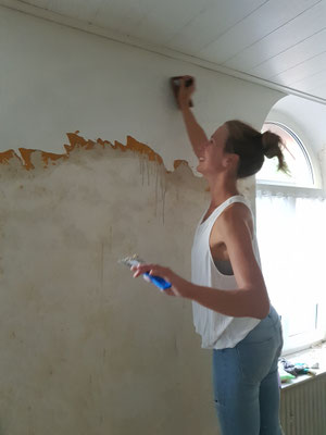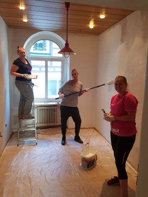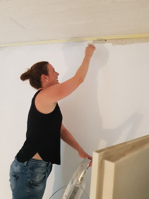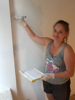 Noch bevor ich rumfragen konnte, wer Lust hat mir ein wenig bei der Renovierung zu helfen, hatte ich ein komplettes Team an freiwilligen Helfern zusammen. Ich fing also schonmal an, die Decken zu streichen und mein Mann flickte sämtliche Löcher, die nach Putz lächzten. Dann durfte die Streichtruppe ran. Logo gabs ne Streichparty.